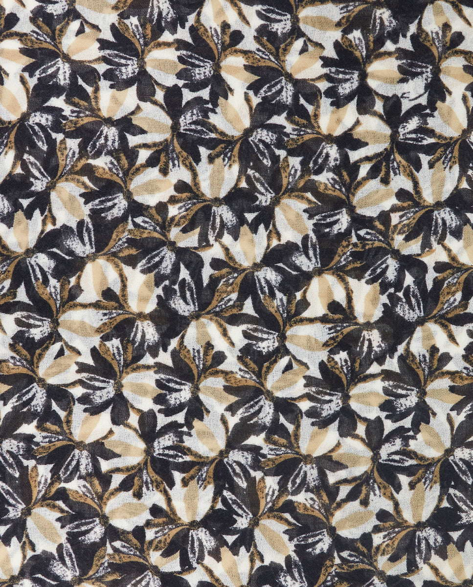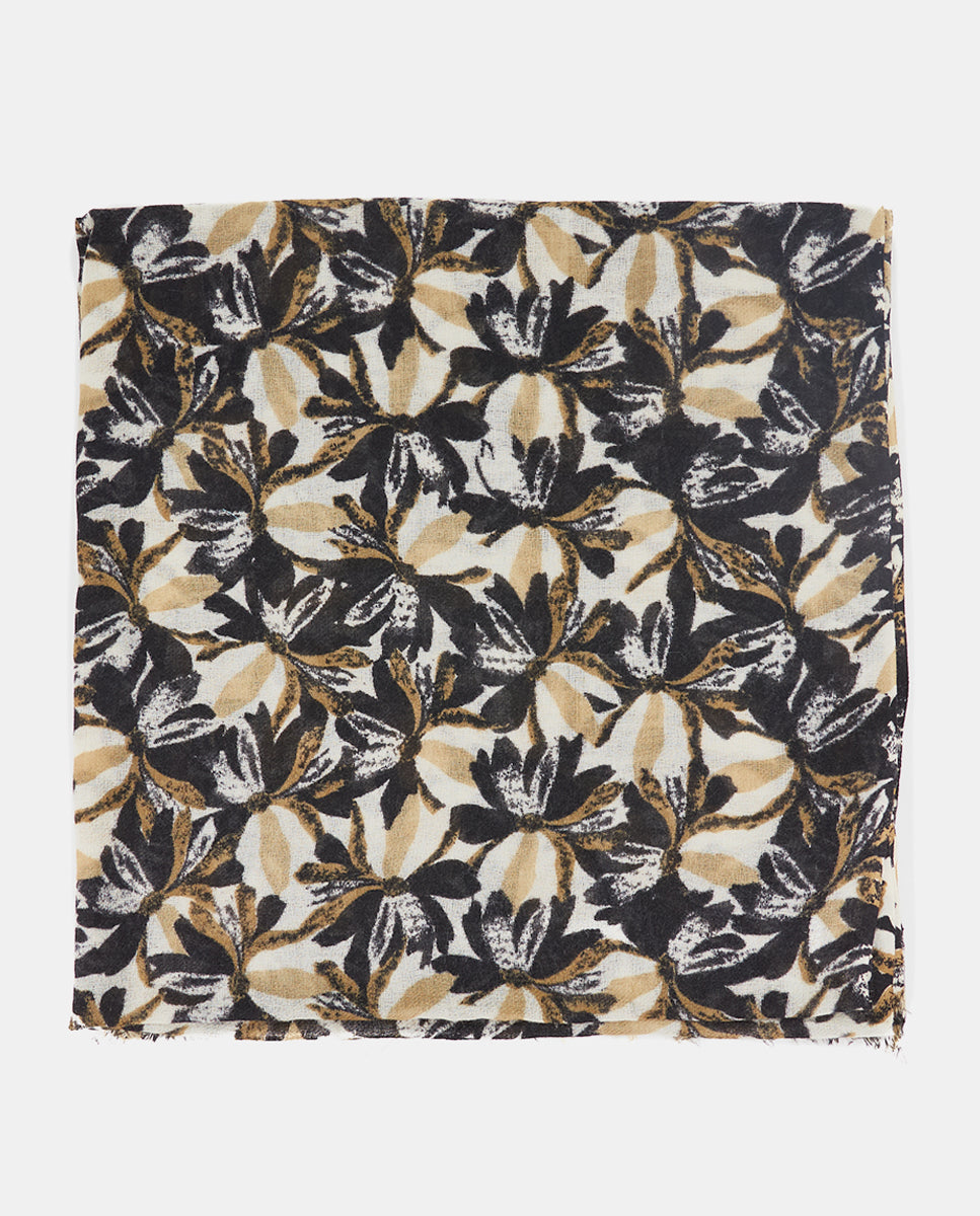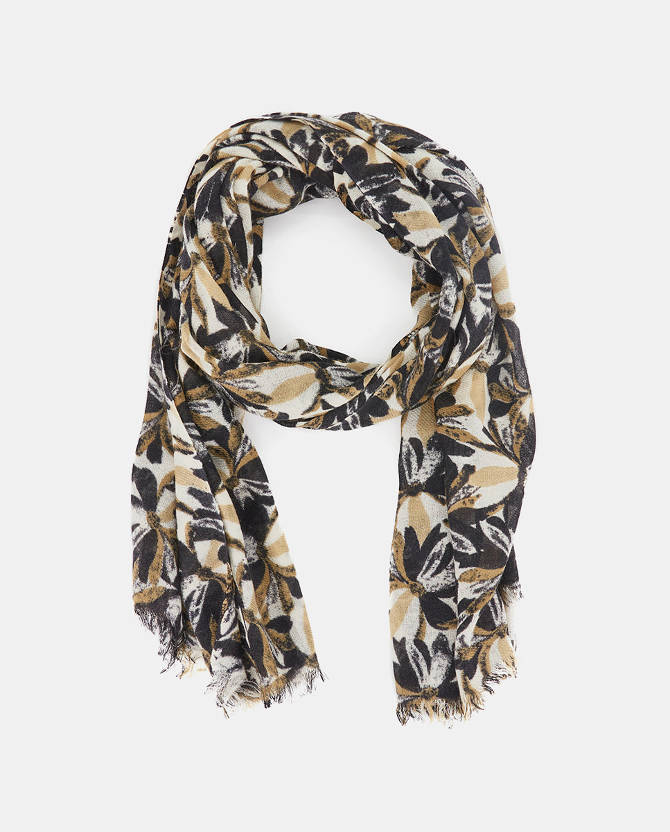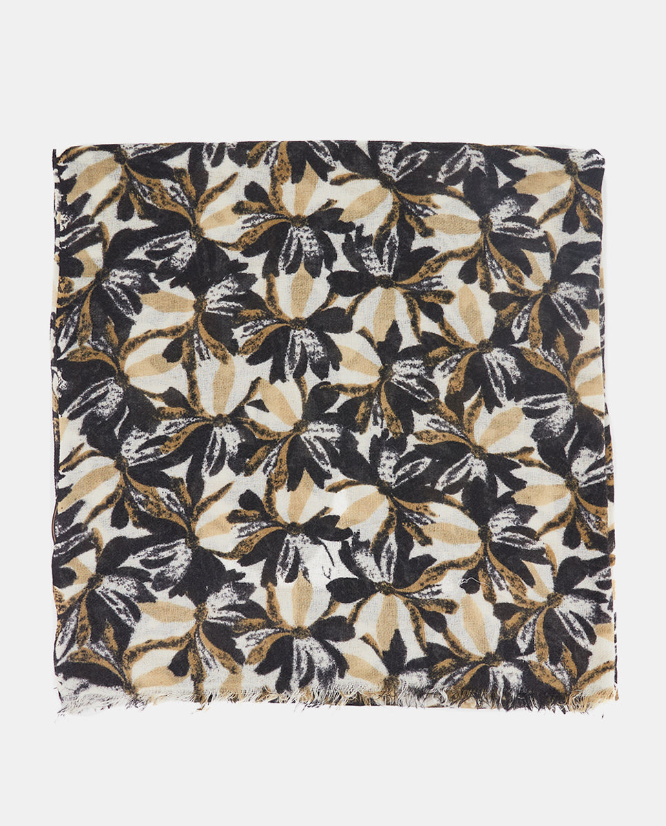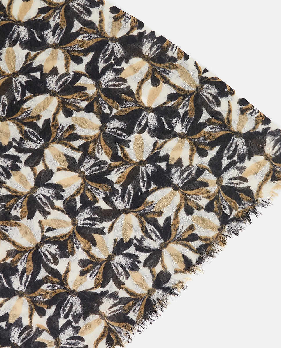 Soft, lightweight wool scarf with a floral print. A versatile and functional accessory, ideal for any occasion. Frayed edges.