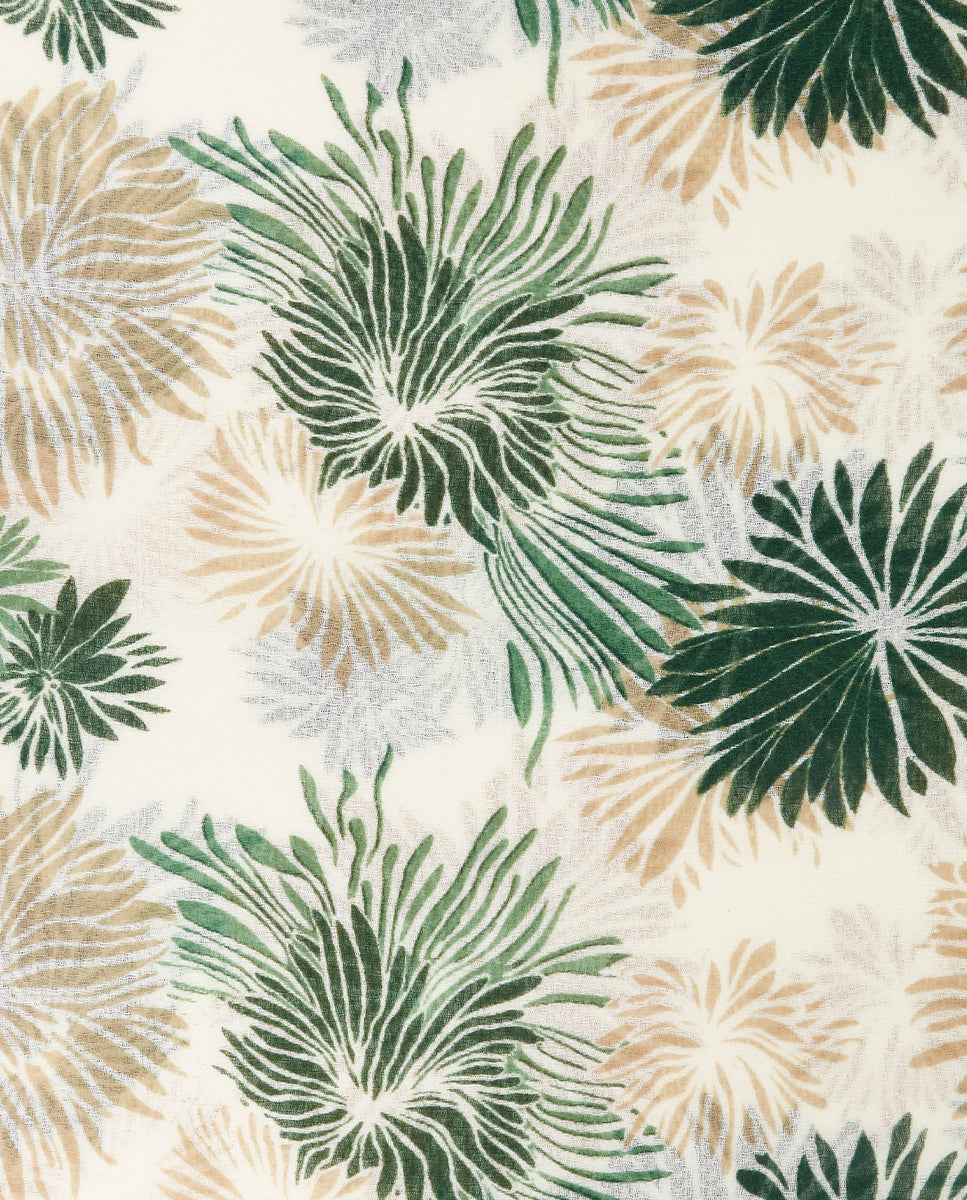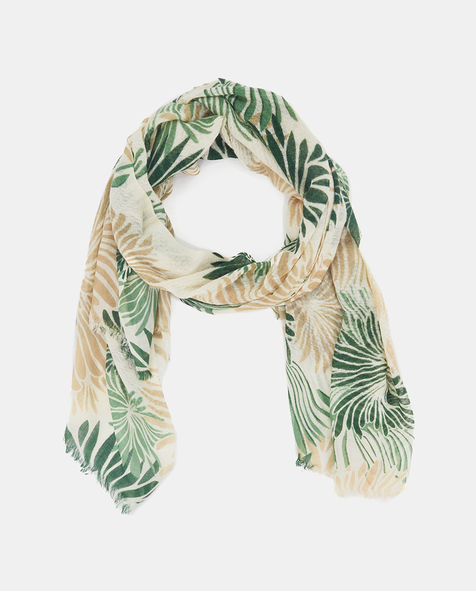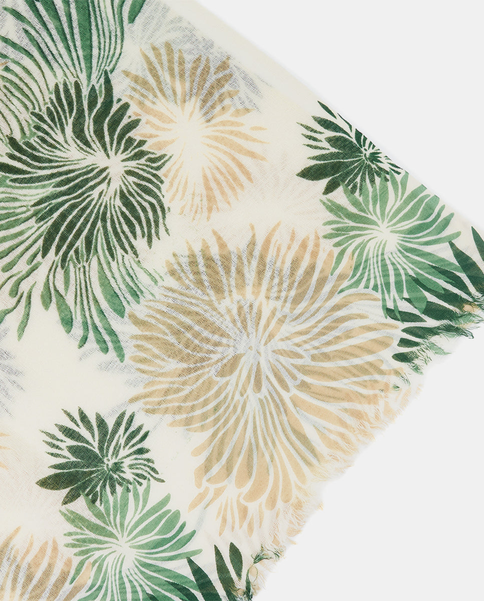 Soft, lightweight wool scarf with a maxi floral print. A versatile and functional accessory, ideal for any occasion. Frayed edges.