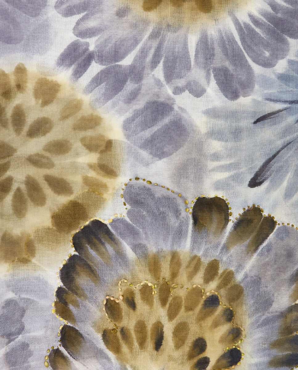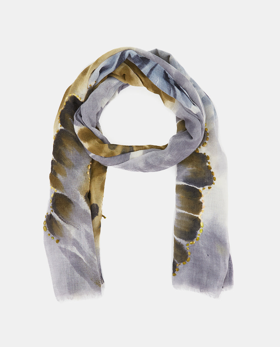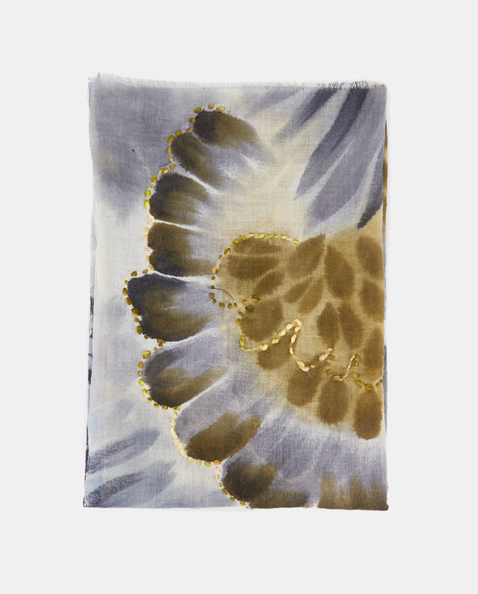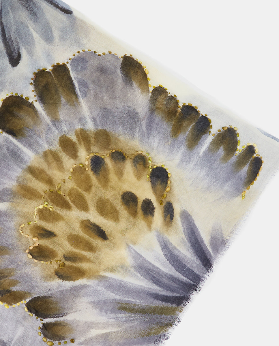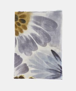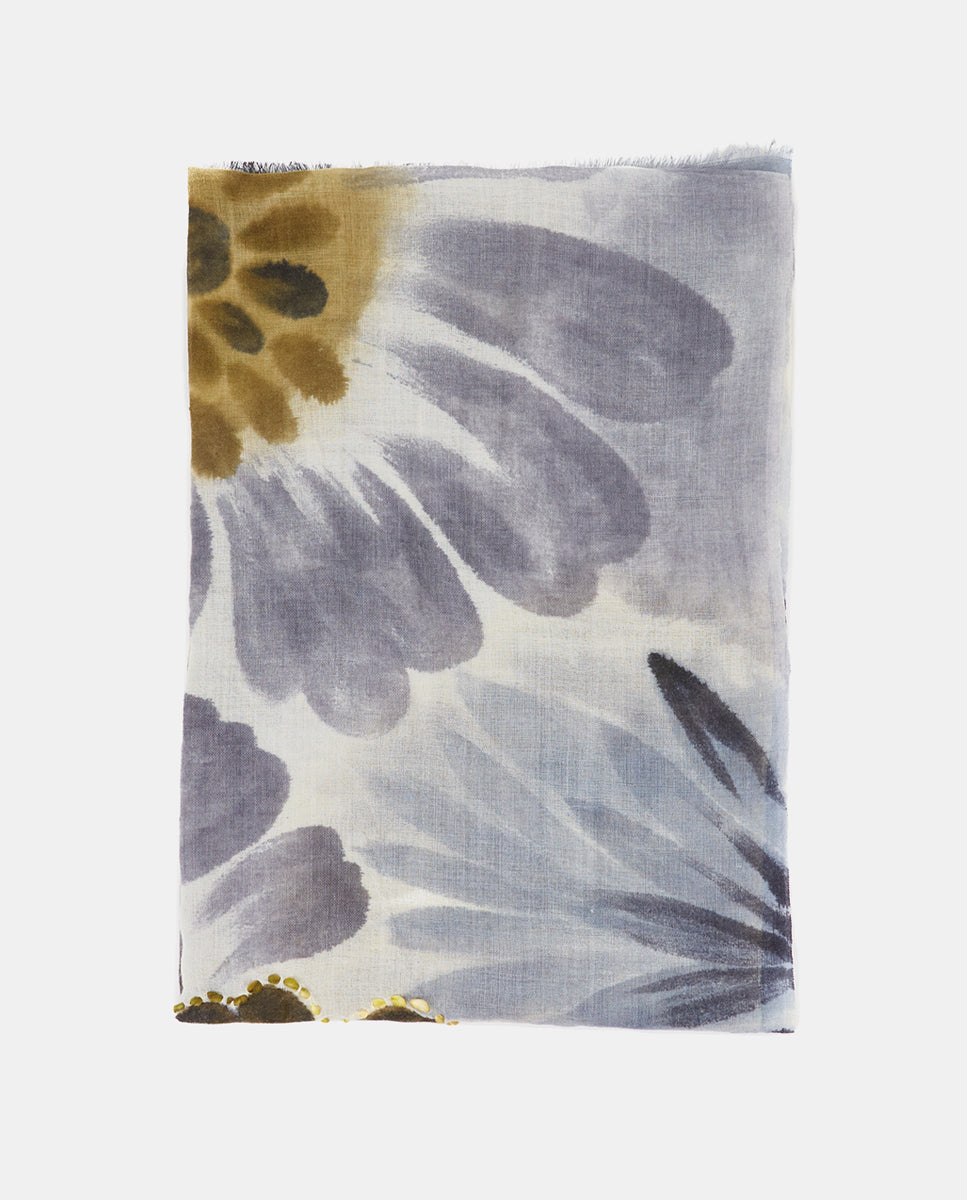 Soft, lightweight wool scarf with a maxi floral print. A versatile and functional accessory, ideal for any occasion. Frayed edges.