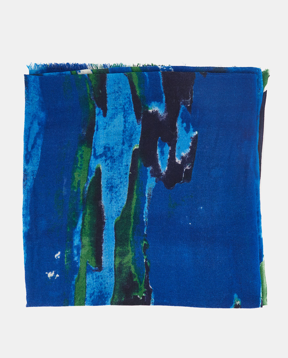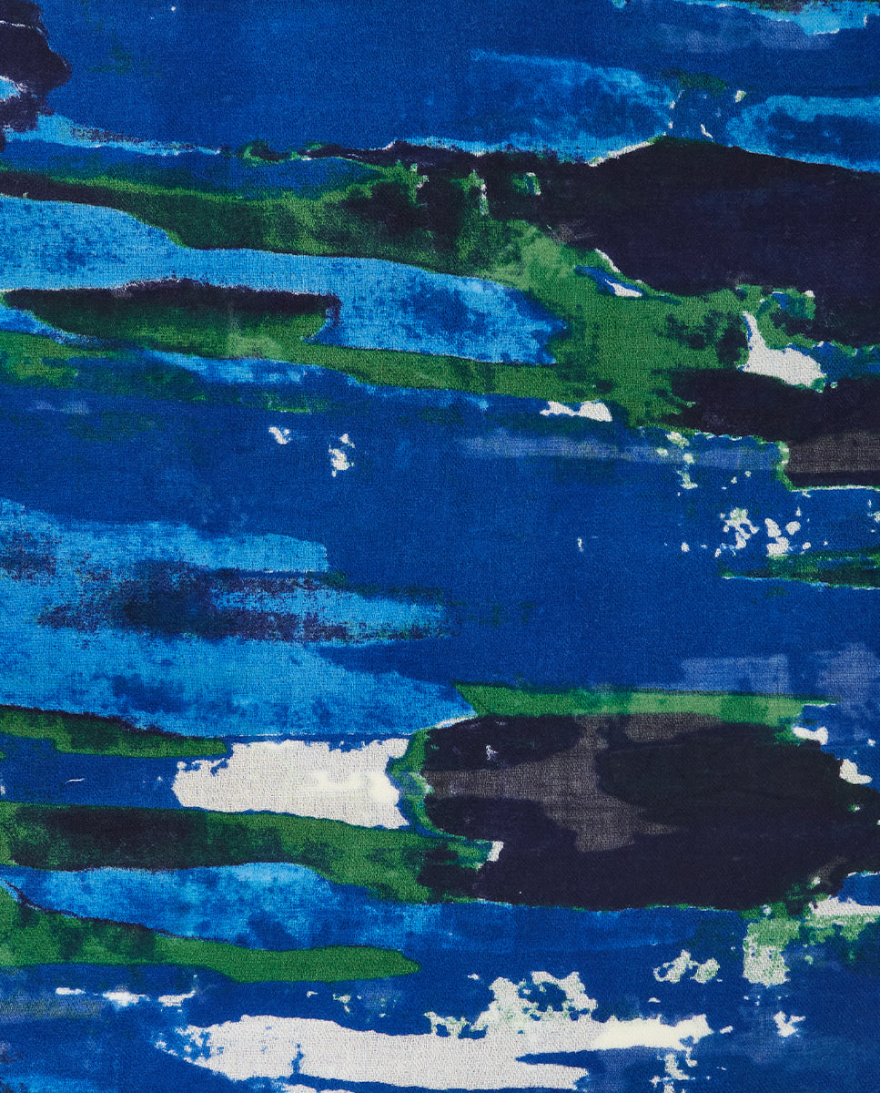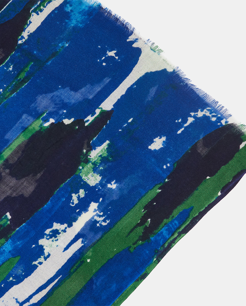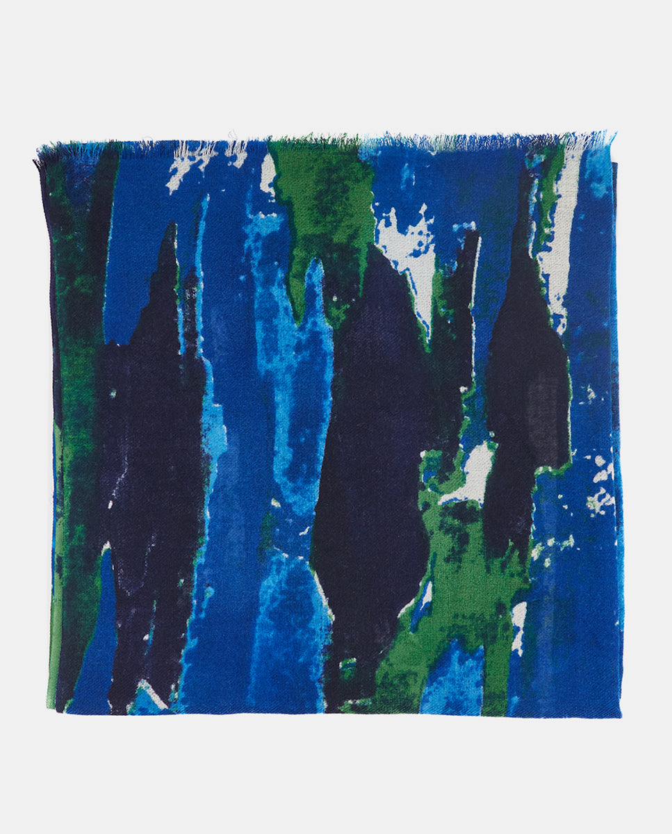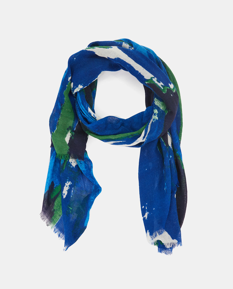 Soft, lightweight wool scarf with an abstract print. A versatile and functional accessory, ideal for any occasion. Frayed edges.