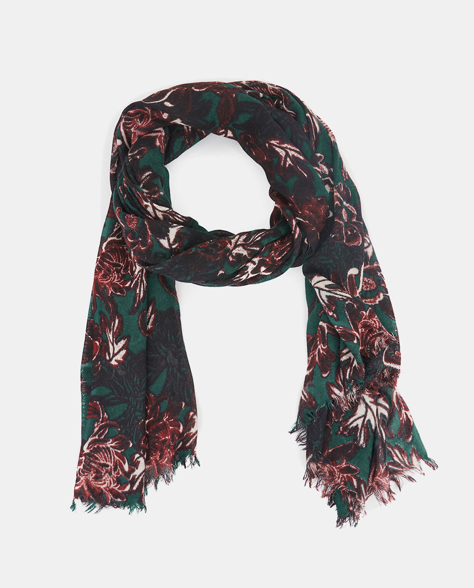 Soft, lightweight wool scarf with a floral print. A versatile and functional accessory, ideal for any occasion. Frayed edges.