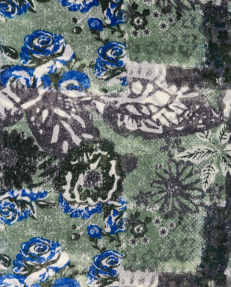 Soft, lightweight wool scarf with an abstract print. A versatile and functional accessory, ideal for any occasion. Frayed edges.