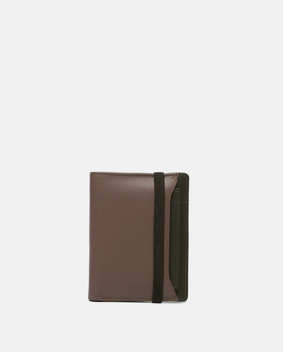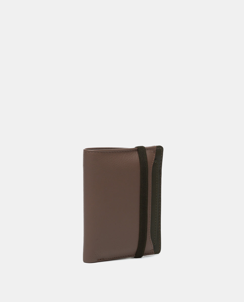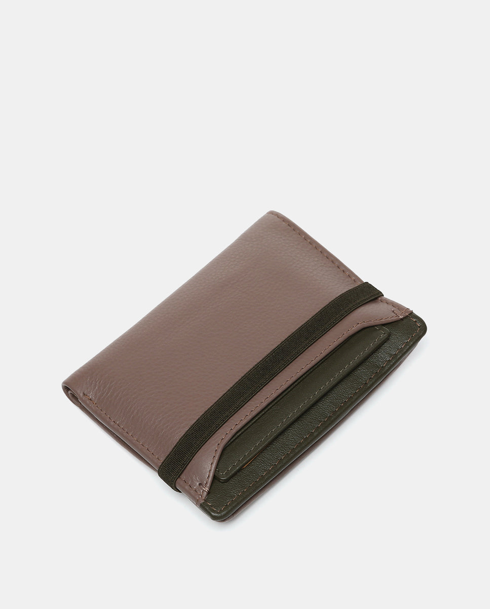 Men’s wallet made of cowhide leather. A very practical model with an elastic closure that combines two color tones. It features several organizational compartments for cards and bills, an interior coin pocket, and an exterior removable cardholder. RFID protection system.