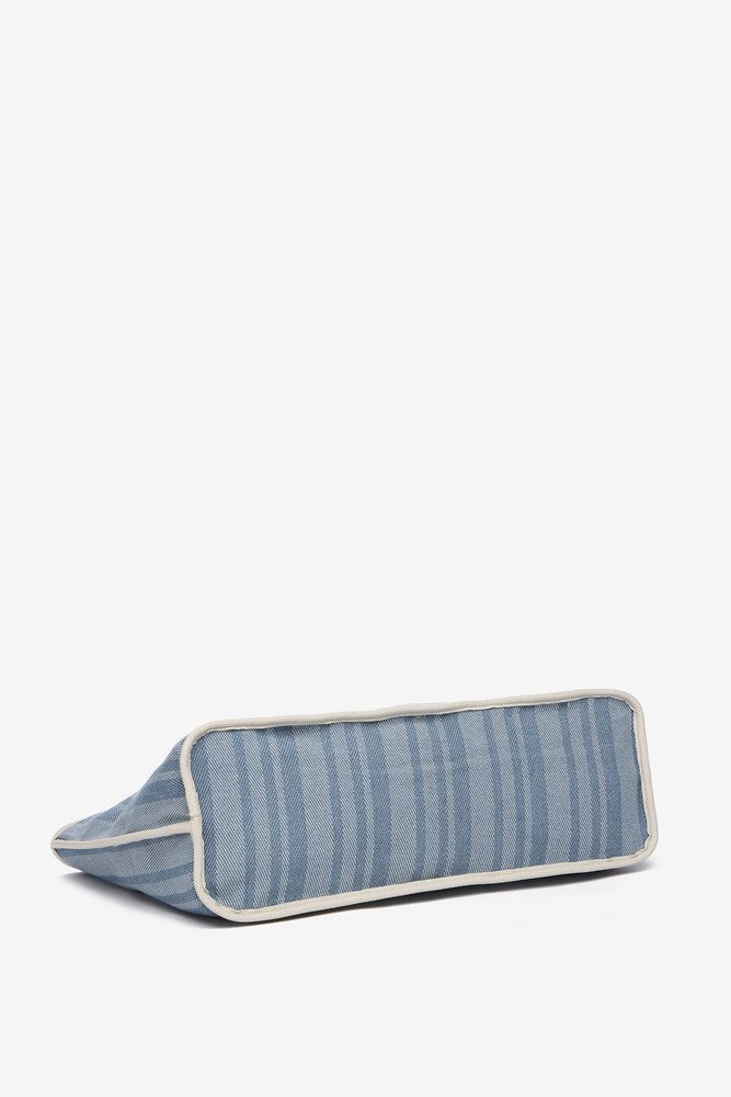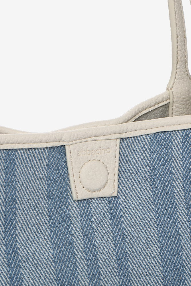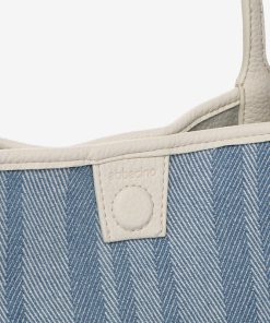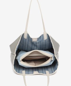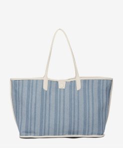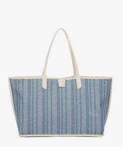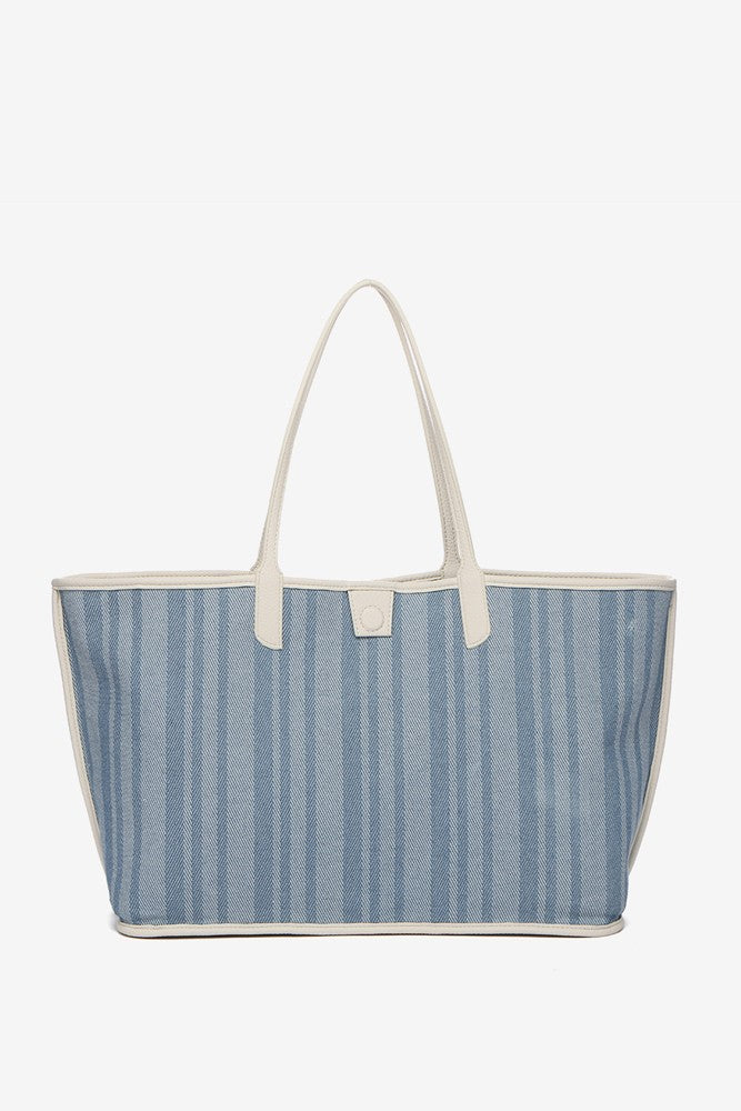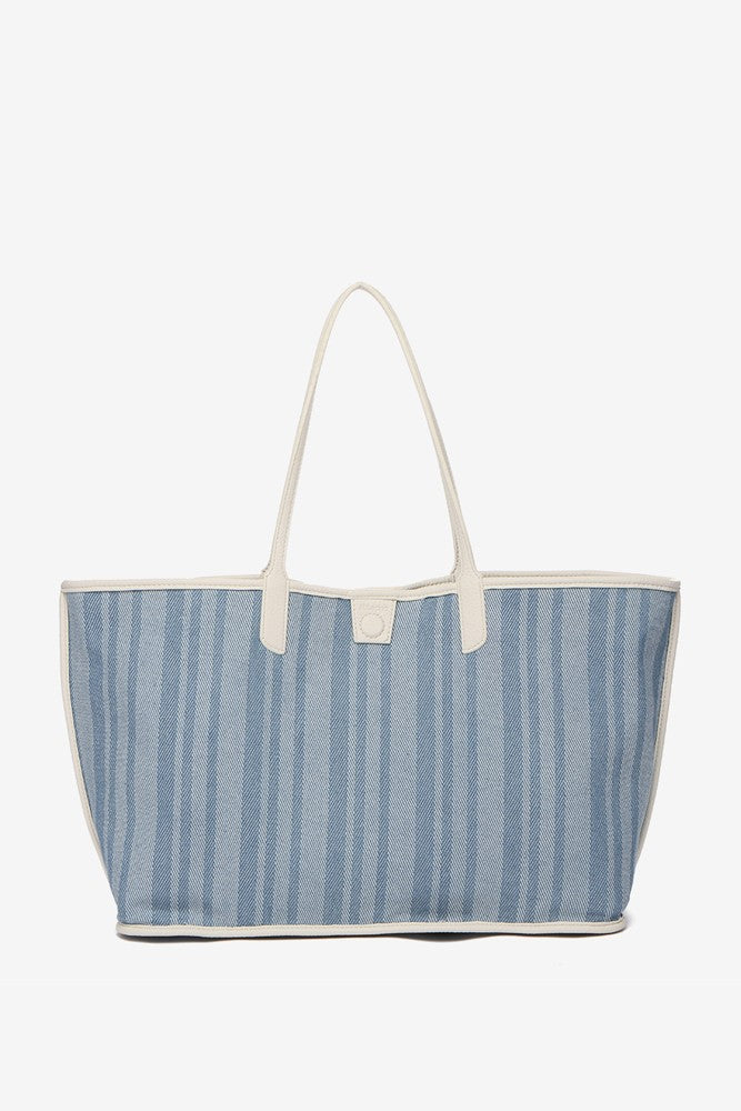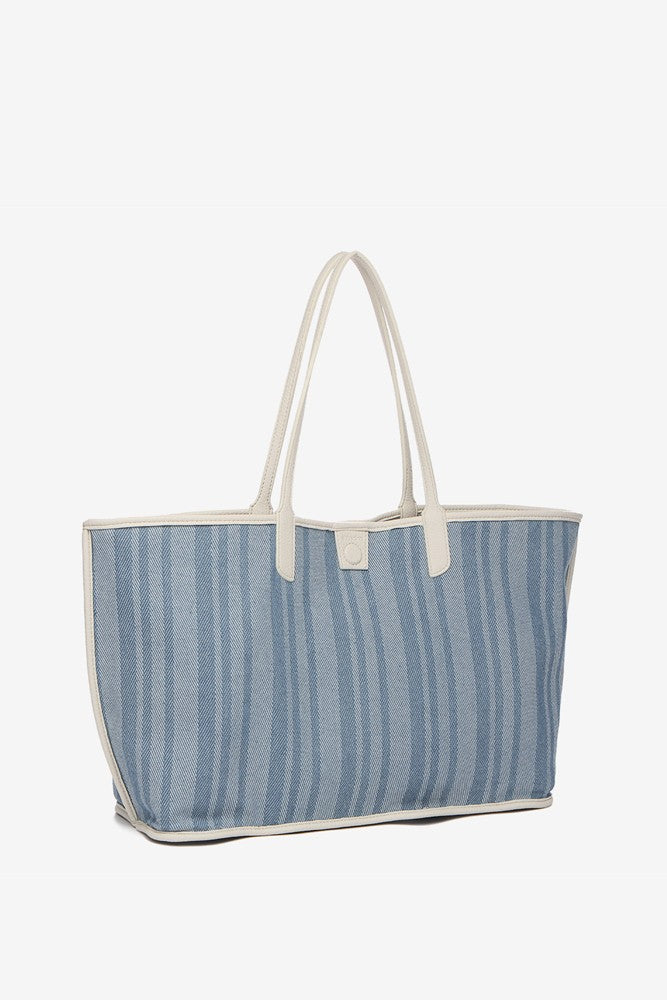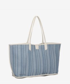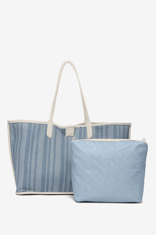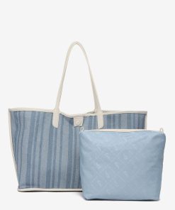 Women’s large capacity shopper bag crafted from synthetic materials. This bag has the particularity of being reversible: on one side, it features a solid color, on the other, a beautiful linear sailor-style pattern. Its main features include: