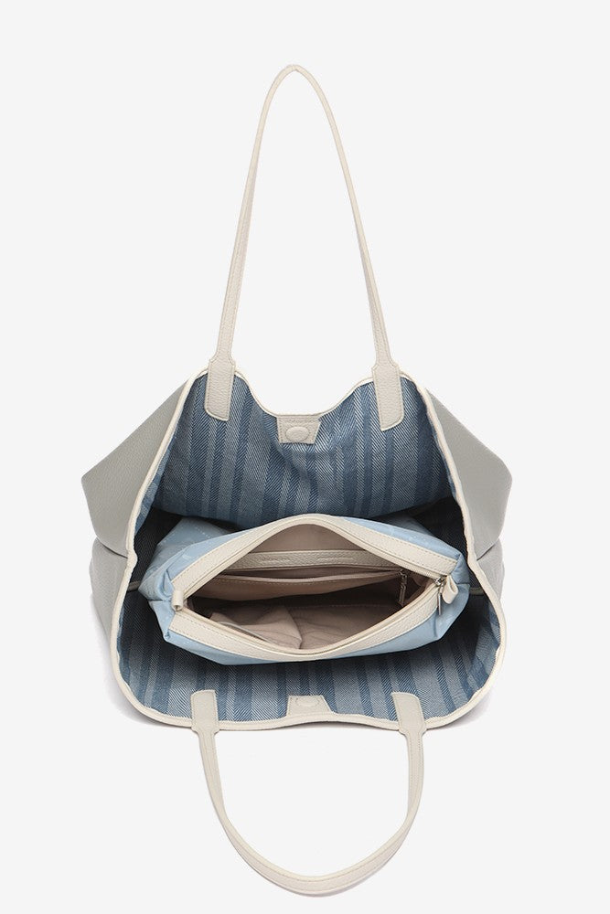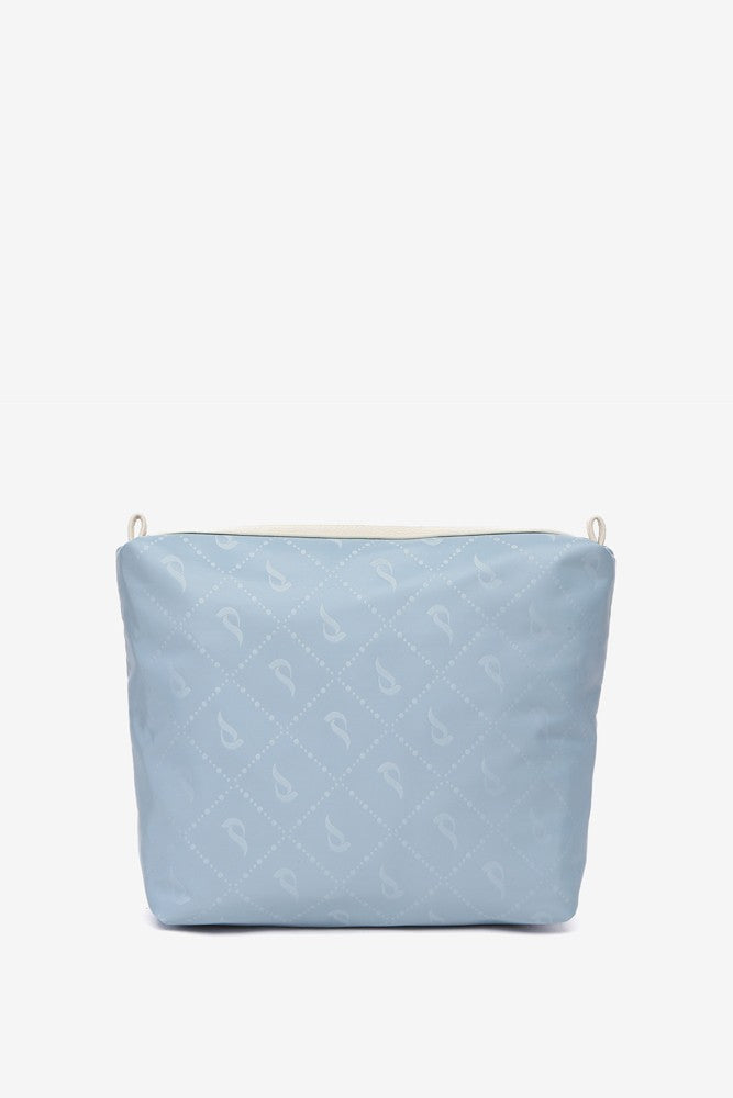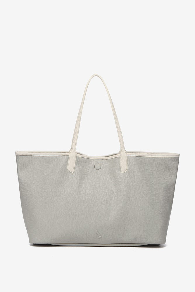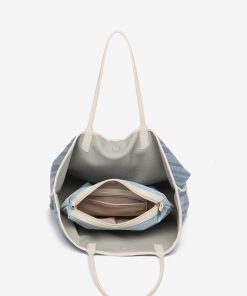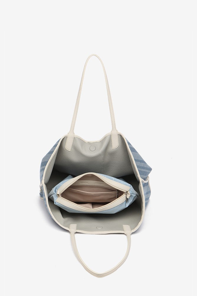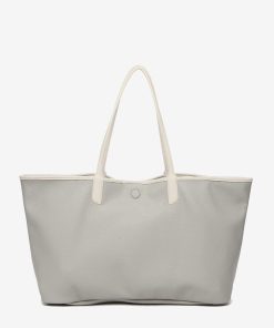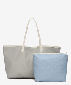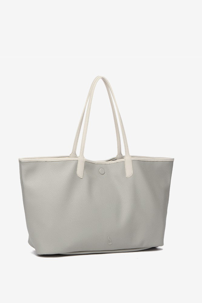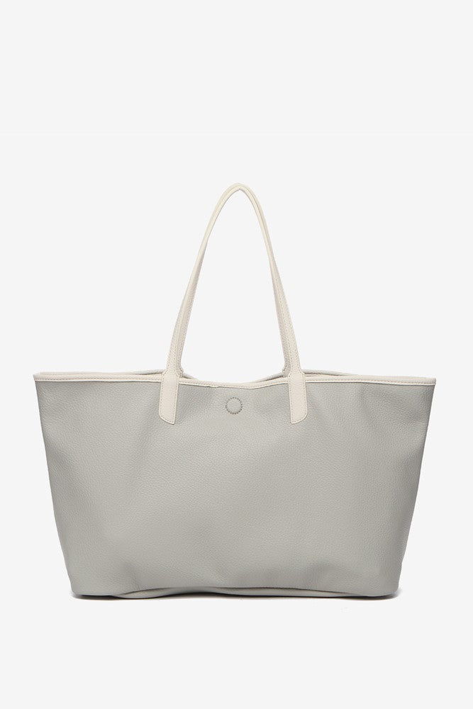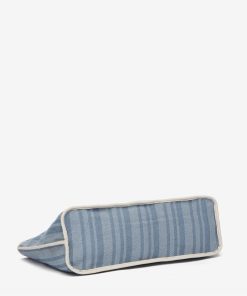 Women’s large capacity shopper bag crafted from synthetic materials. This bag has the particularity of being reversible: on one side, it features a solid color, on the other, a beautiful linear sailor-style pattern. Its main features include: