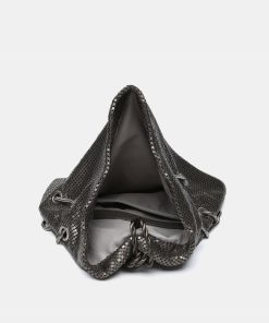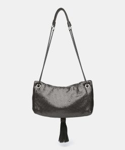 • Its metallic handles are adjustable, allowing them to be used as shoulder straps or a crossbody strap.