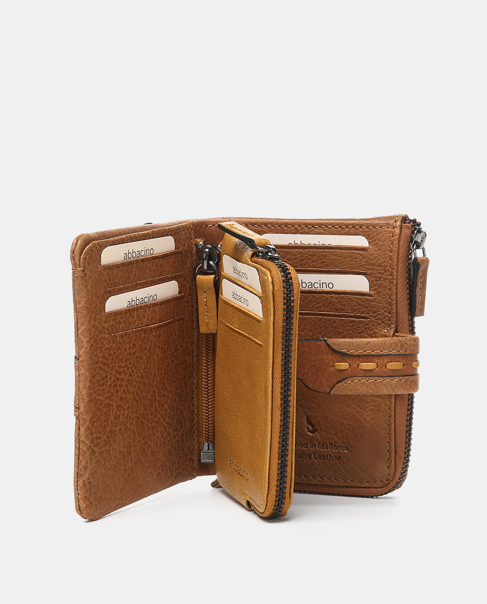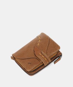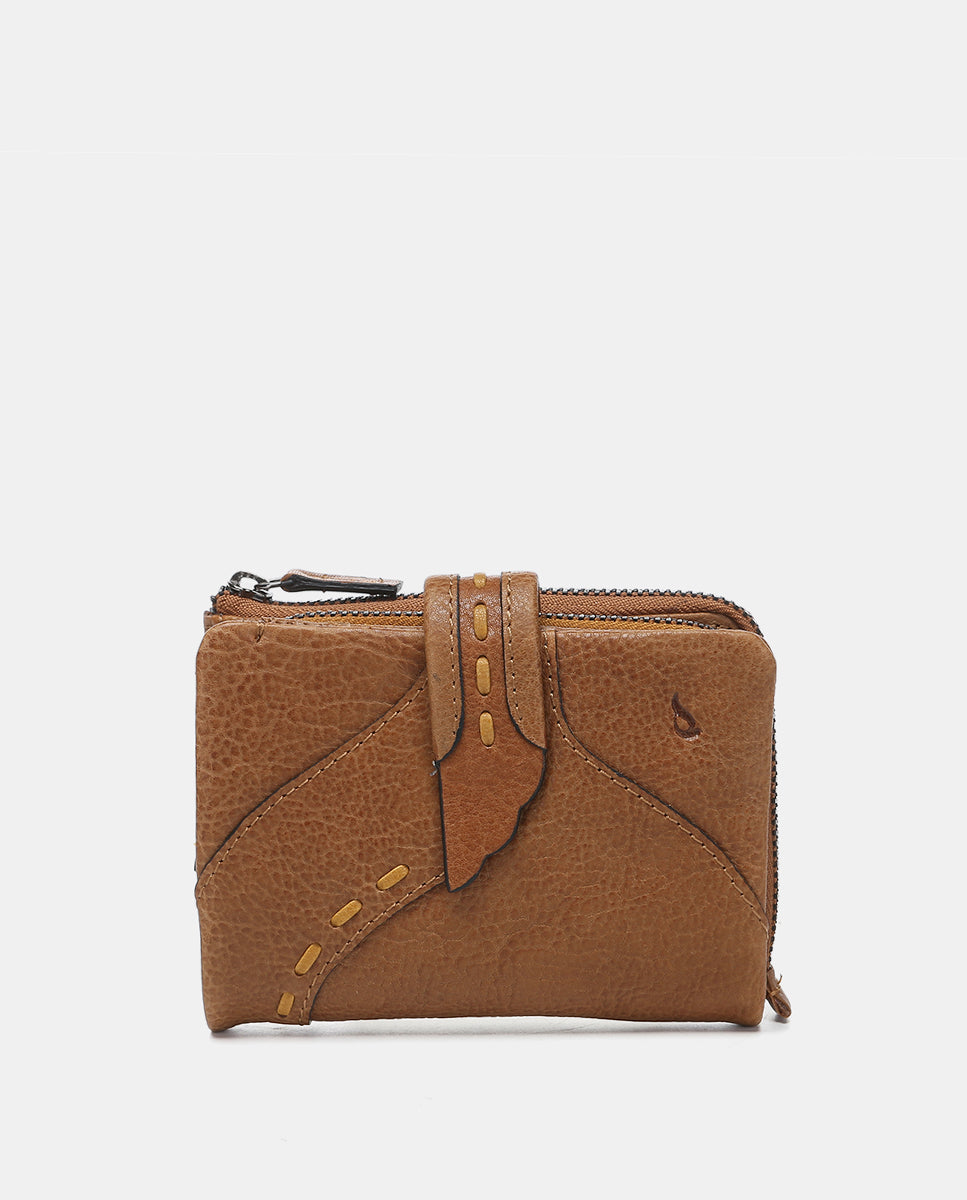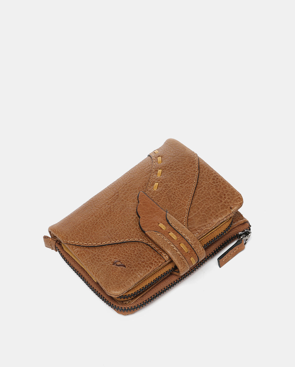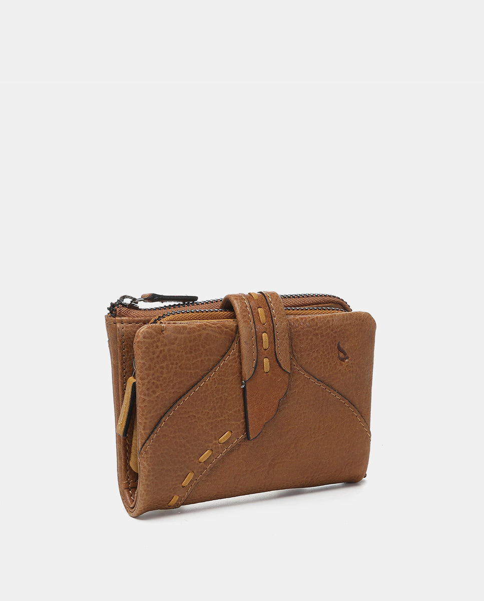 Small women’s wallet made from leather. A design that stands out for its front flap closure and fine embroidery, which creates a curved silhouette. Its main features are: