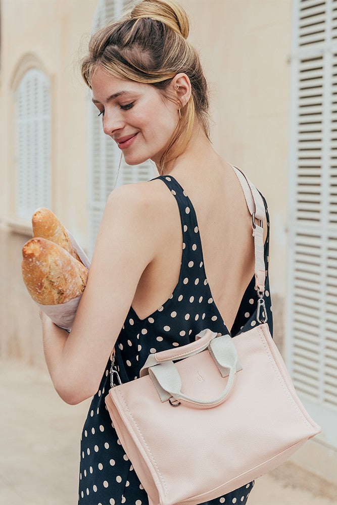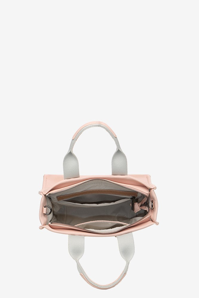 • It combines its double hand strap with a practical shoulder strap personalised with the Abbacino logo, which can be adjusted and is removable.